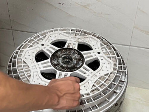 3,將棉絮過濾網(wǎng)輕輕取下,內(nèi)面回轉(zhuǎn),在水龍頭下用舊牙刷邊沖邊刷。